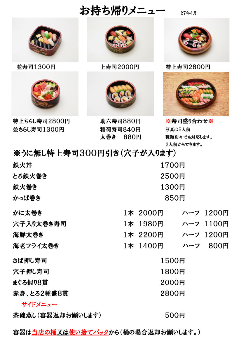 現在仕入れの高騰により、お持ち帰りメニュー表示価格の中には、価格の変更を余儀なくされる商品もありますこと、何とぞご理解を賜りますようお願い申し上げます。