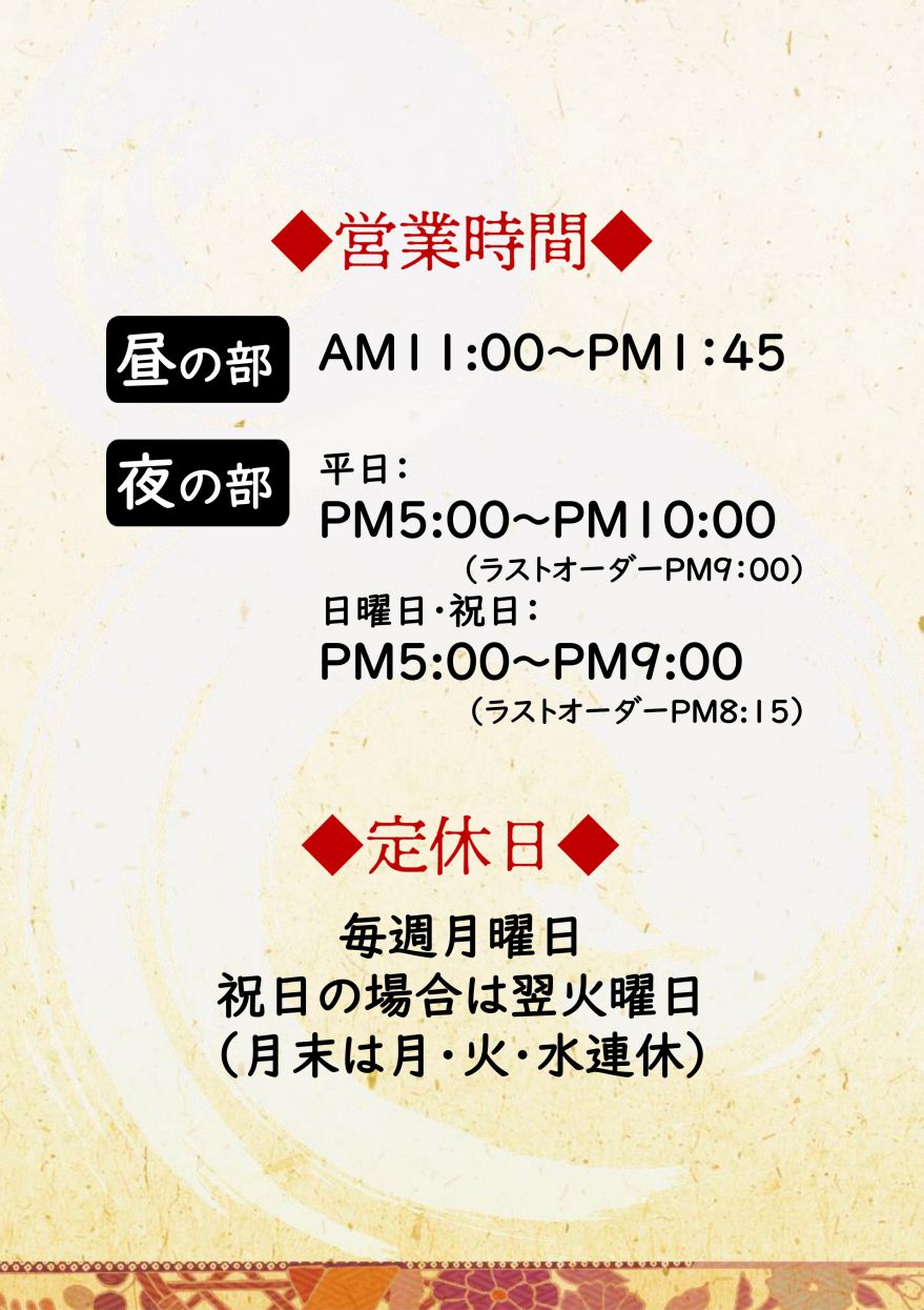 一宮市西島町2丁目15番地 TEL:0586-71-8228 営業時間 昼の部 11:00~13:45 夜の部 平日:17:00~22:00(L.O. 21:00) 日曜・祝日:17:00~21:00(L.O. 20:15) 定休日 毎週月曜日 (月末は月曜日、火曜日、水曜日)